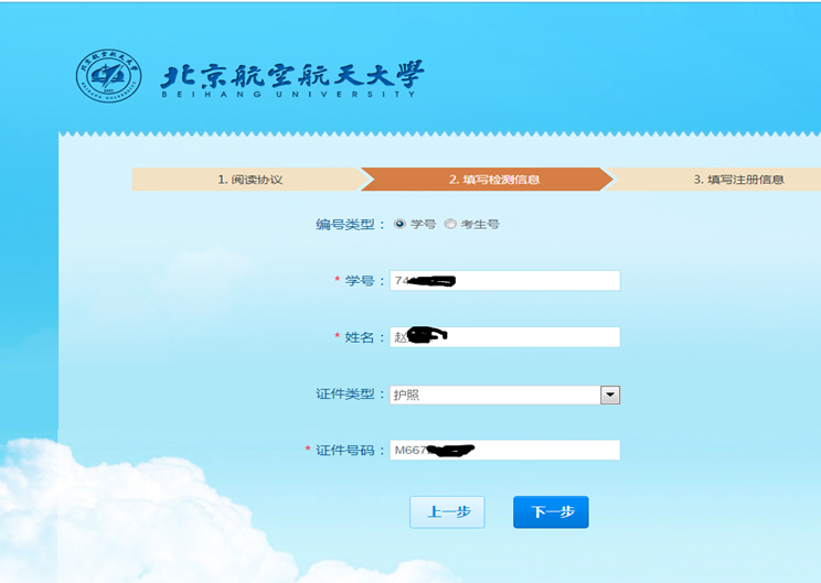 4、输入 学号 姓名;证件类型里,选择护照输入证件号码;点击 下一步