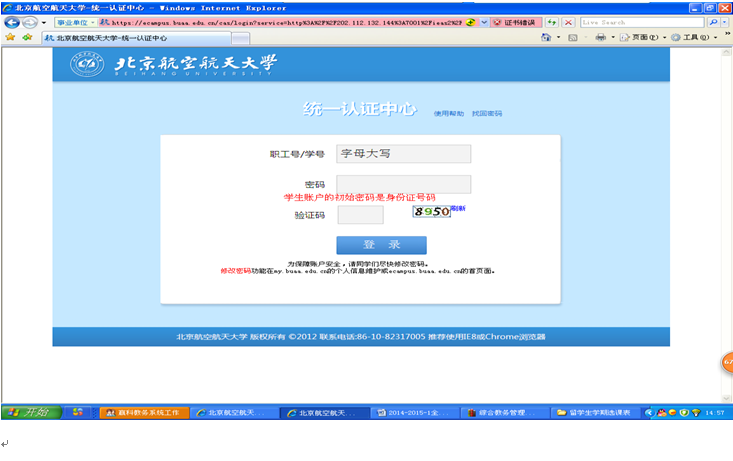 北航统一身份认证中心输入学号、密码和验证码后登录